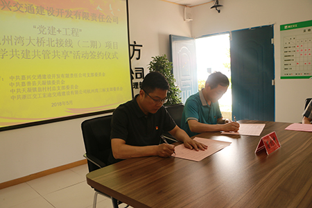 5月12日上午,交建公司“黨建+工程”暨杭州灣大橋北接線(二期)項(xiàng)目“共學(xué)共建共管共享”活動(dòng)簽約儀式在TJ03標(biāo)舉行,灣北二期項(xiàng)目各參建單位、天凝鎮(zhèn)、翁村村等相關(guān)負(fù)責(zé)人、黨員代表參加簽約儀式。